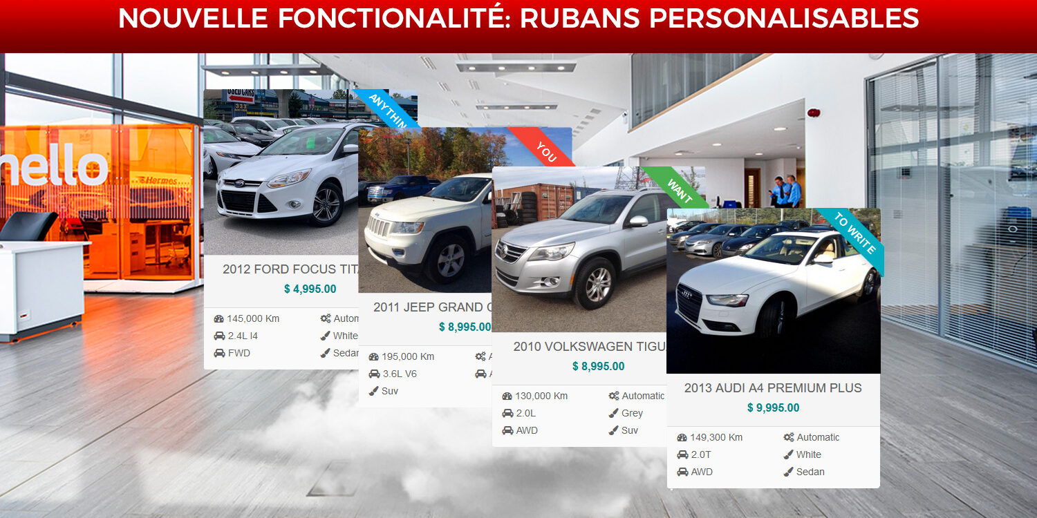 Comme son nom l’indique, les rubans automatiques apparaissent automatiquement pour mettre en évidence certains véhicules. Les 2 conditions conditions qui déclenchent un ruban automatique sont: un véhicule en vedette et/ou un véhicule avec un prix réduit.